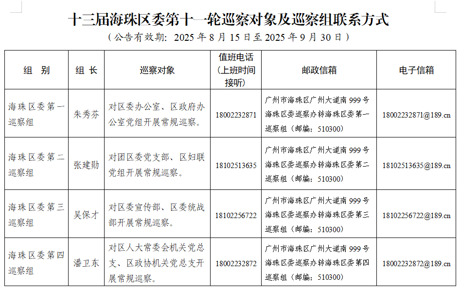 本轮巡察从2025年8月15日开始,2025年9月30日完成现场巡察工作。巡察组受理信访时间截至2025年9月30日。娱乐城平台区委巡察办公布了各巡察组的组长名单以及在巡察期间设置的值班电话、邮政信箱和电子信箱。