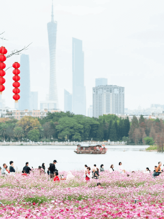 成片花海与远处的广州塔、广州市文化馆交相呼应