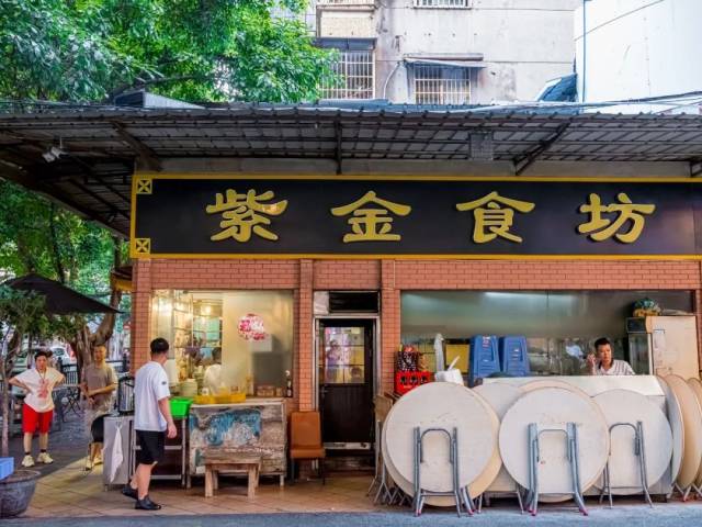 穿过紫龙大街,小广场旁榕树下的紫金食坊,是不得不提的老字号大排档,老广独有的味道。傍晚时,榕树下便坐满了人,先上五指毛桃炖汤,边喝边等,接着上来的烧鸭皮脆肉嫩,茄子煲软绵多汁,五柳炸蛋、姜汁芥蓝也是“定律必点”,好味菜式耳熟能详。坐在此间,等华灯初上的独有感觉,便是江南西的烟火气最好的注脚。