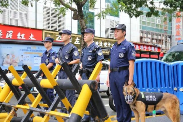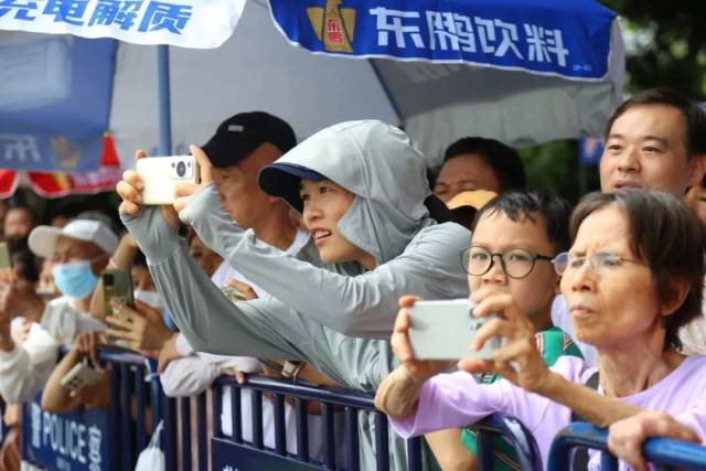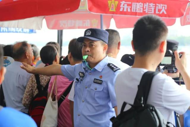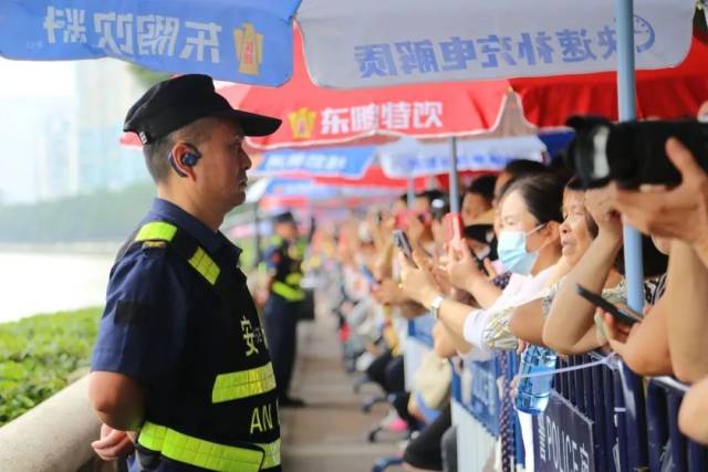 一道道身影守护在珠江边上的栏杆内,为两岸群众筑起一道蓝色的安全防线,全力保障市民群众观赏安全。