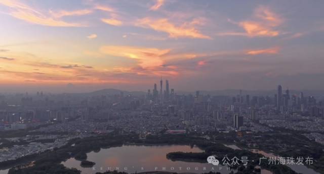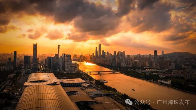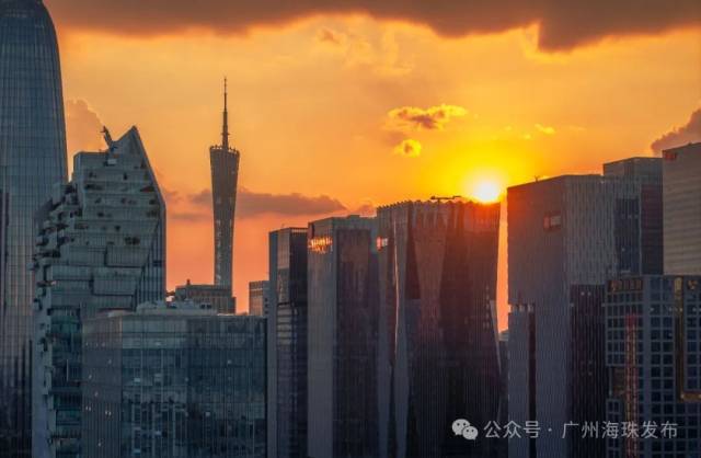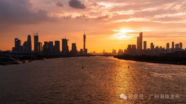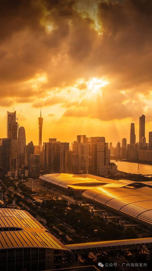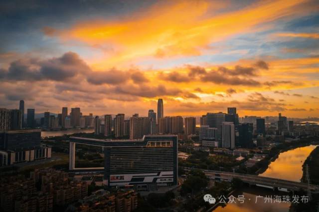 琶洲试验区国际范儿、科技感、高颜值的都市建筑群,被黄昏披上一层金黄色外纱,一洗往日严肃氛围,尽显城市浪漫。