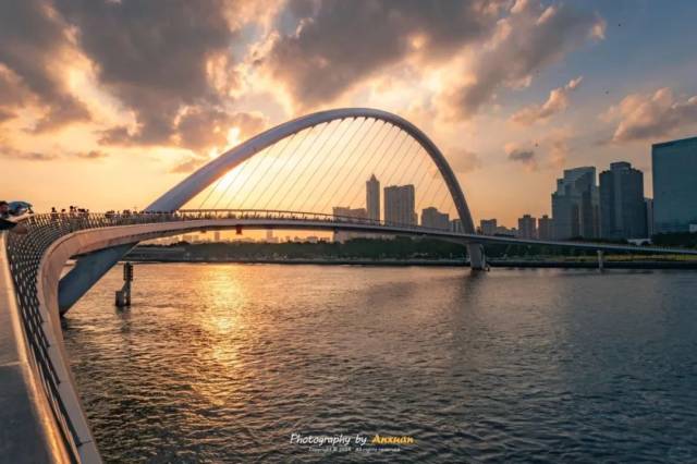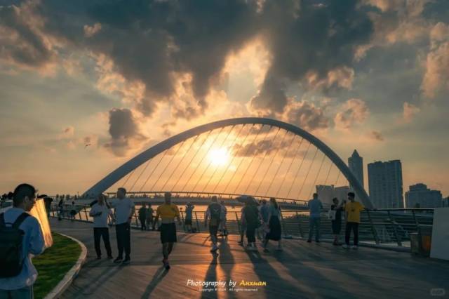在落日时分到海心桥散步,落日熔金,霞光万丈笼罩着整座跨江行人桥。