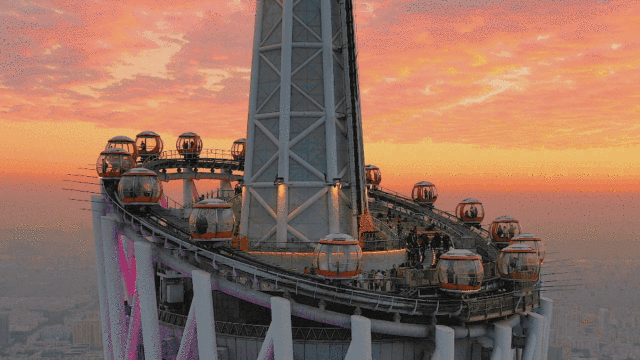 还可以乘坐460米高的横向摩天轮,在透明的球舱中,用20分钟,欣赏360°全景夕阳,收集城市美景。